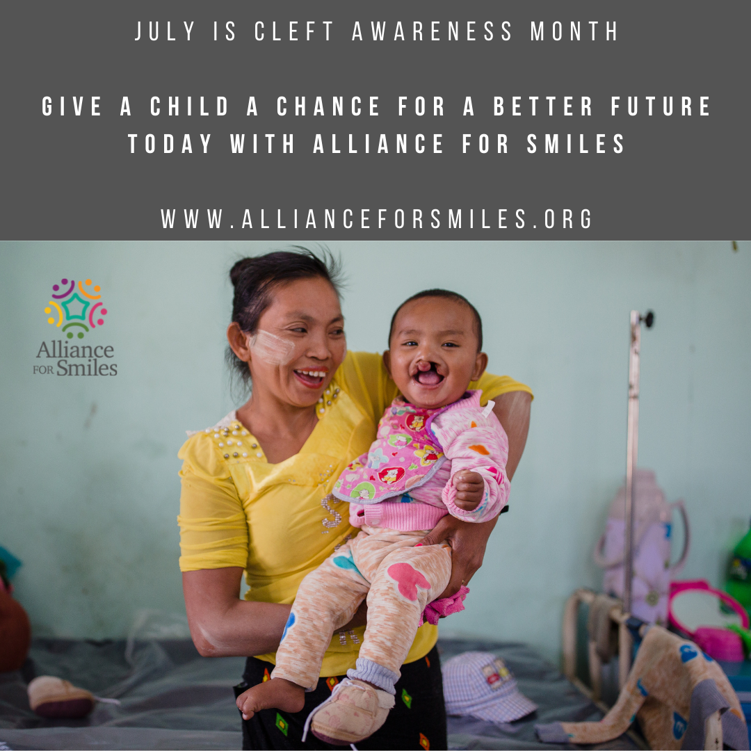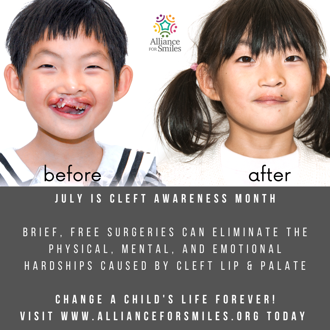 - July is Cleft Awareness Month! Join me in raising awareness about cleft conditions and check out allianceforsmiles.org to learn what you can do to help!