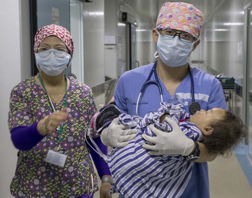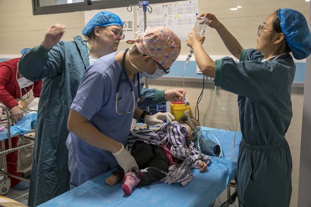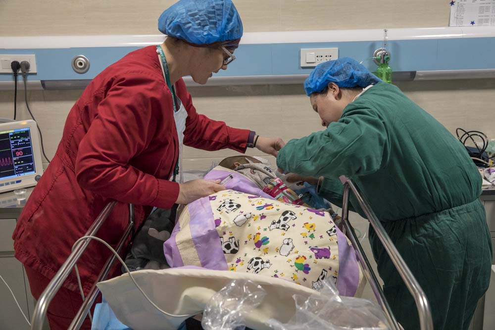 Anesthesiologist Ye and supporter Magdalen taking little Yue from the OR to Recovery room.